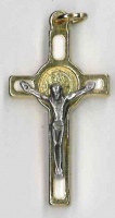 | | Benediktuskreuz (emailliert) weiß/goldfarbenDer hl. Mönchsvater Benedikt (+547) verehrte das hl. Kreuz ganz besonders und wirkte schon zu Lebzeiten viele Wunder, nicht zuletzt im Kampf gegen Dämonen. Ab dem 11. Jahrhundert wurden Medaillen angefertigt, die das Kreuz und das Abbild Benedikts tragen und beidseitig mit den Buchstaben starker Befreiungsgebete gegen die bösen Mächte versehen sind. Außerdem entstanden die Benediktuskreuze, welche die Medaille mit einem Kruzifix kombiniert beinhalten. Diese Kruzifixe werden von Gläubigen gern getragen und von Priestern im Heilungs- und Befreiungsdienst verwendet.