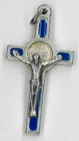 | | Benediktuskreuz (emailliert) blau/silberfarbenDer hl. Mönchsvater Benedikt (+547) verehrte das hl. Kreuz ganz besonders und wirkte schon zu Lebzeiten viele Wunder, nicht zuletzt im Kampf gegen Dämonen. Ab dem 11. Jahrhundert wurden Medaillen angefertigt, die das Kreuz und das Abbild Benedikts tragen und beidseitig mit den Buchstaben starker Befreiungsgebete gegen die bösen Mächte versehen sind. Außerdem entstanden die Benediktuskreuze, welche die Medaille mit einem Kruzifix kombiniert beinhalten. Diese Kruzifixe werden von Gläubigen gern getragen und von Priestern im Heilungs- und Befreiungsdienst verwendet.