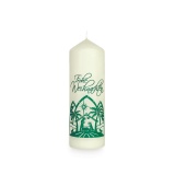 Deutsche Qualitätskerze, welche in grün die Hl. Familie zeigt, mit dem Schriftzug: "Frohe Weihnachten". (Siebdruck) Höhe: 16 cm, Durchmesser: 6 cm Preis/Kg: