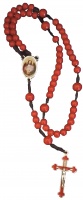Handgeknüpfter Holzrosenkranz. Das Mittelstück zeigt ein Herz-Jesu-Bild sowie das "Herz-Jesu-Schild". Länge ca. 34 cm.