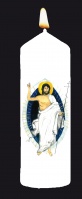 Kerze aus elfenbeinfarbenem deutschen Qualitätswachs, mit Siebdruckbild des Auferstandenen. Durchmesser: 6cm, Höhe 16 cm