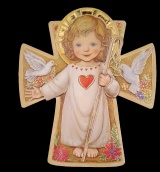 | | Jesuskind mit StabJesuskind mit Stab des Guten Hirten in der Hand, begleitet von Tauben und mit Hinweis auf die Eucharistie. Kleies 4mm diches Kreuz aus stapazierfähigem Kunststoff (Holzimitat). Reliefdruck mit goldfarbenen Elementen. Zum Aufhängen oder Hinstellen.