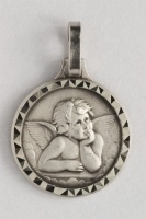 Schutzengel-Medaille Neusilber - 12 mmVorderseite: Brustbild eines Engelchens nach dem berühmten Renaissance-Bild von Raffael (1512/13): "Sixtinische Madonna". Einfassung auf der Vorderseite: diamantierter Rand mit leichtem goldfarbenem Schimmer. Rückseite: Prägung "Gott schütze dich".