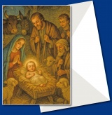 Doppelkarte, mit Blick in den Weihnachtsstall: Maria und Josef, die Hirten und die Tiere, sie alle betrachten das Christkind. Mit Kuvert.
