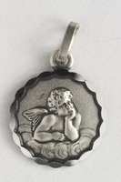 Schutzengel-Medaille aus Silber (925) - 12 mmEin beliebtes Geschenk für Kinder ist die aus 925 Sterlingsilber geprägte Schutzengel-Medaille. Das Motiv zeigt ein Engelchen nach dem Vorbild des berühmten Raffael-Gemäldes „Die Sixtinische Madonna“. Auf der Rückseite befindet sich das Gebet „Gott schütze Dich“. Größe: 12 mm (Durchmesser ohne Öse). Art.Nr.: 9260 Preis: € 12.00  |