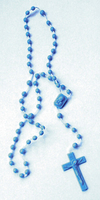 Dieser Plastik-Rosenkranz ist z. Zt. in folgenden Farben erhältlich: rot, hellblau und in einer farblosen, fluoriszierenden (bei Dunkelheit leuchtend) Variante.