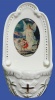 Mit goldfarbigen Details verziertes Weihwasserkesselchen aus weißem Porzellan, auf dem ein ovales Bild des Schutzengels angebracht ...